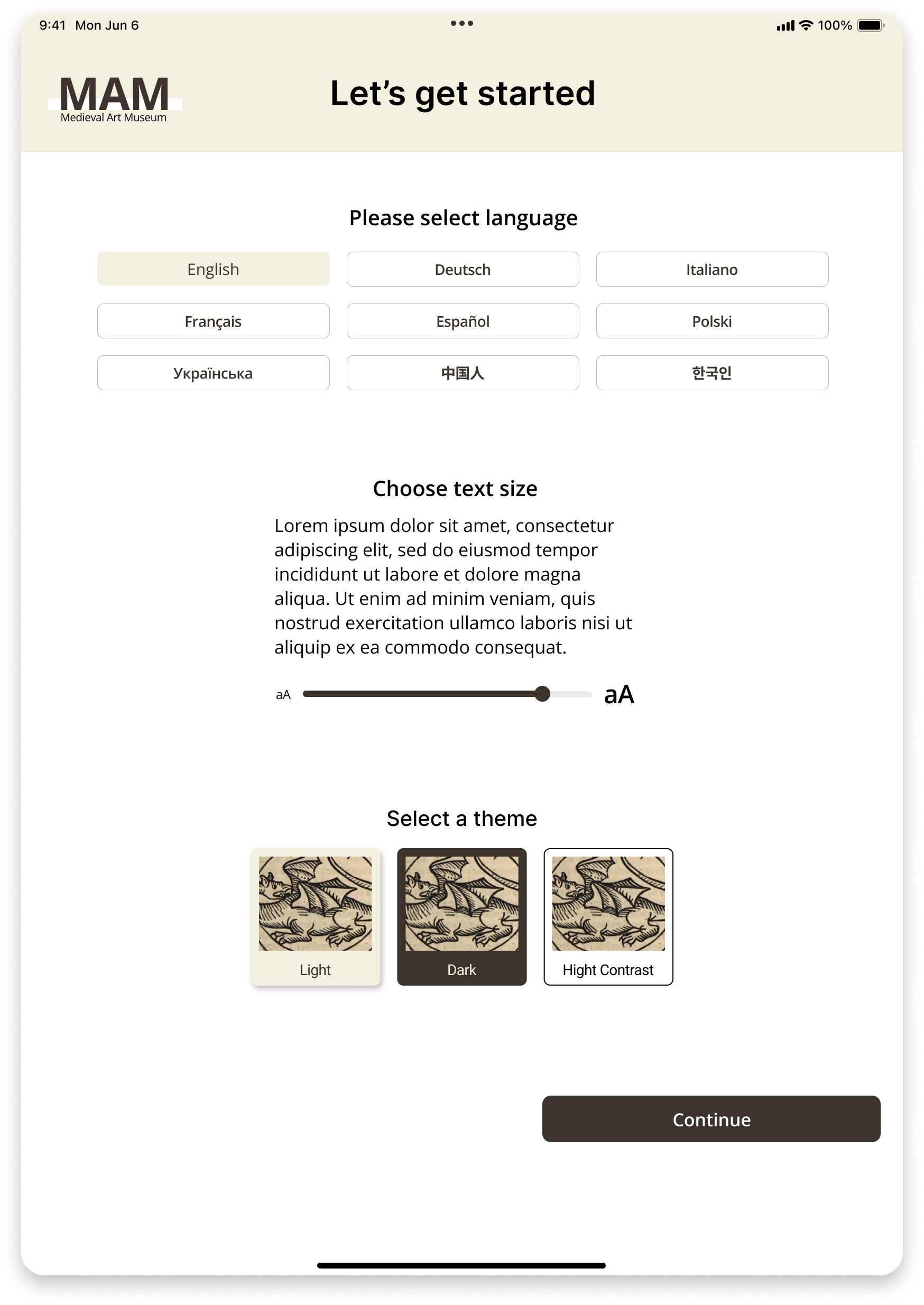 The first stage the user faces is the settings where we can change the language, change the font size, and set a convenient theme for the screen. This makes the Museum guide accessible and easy to use.