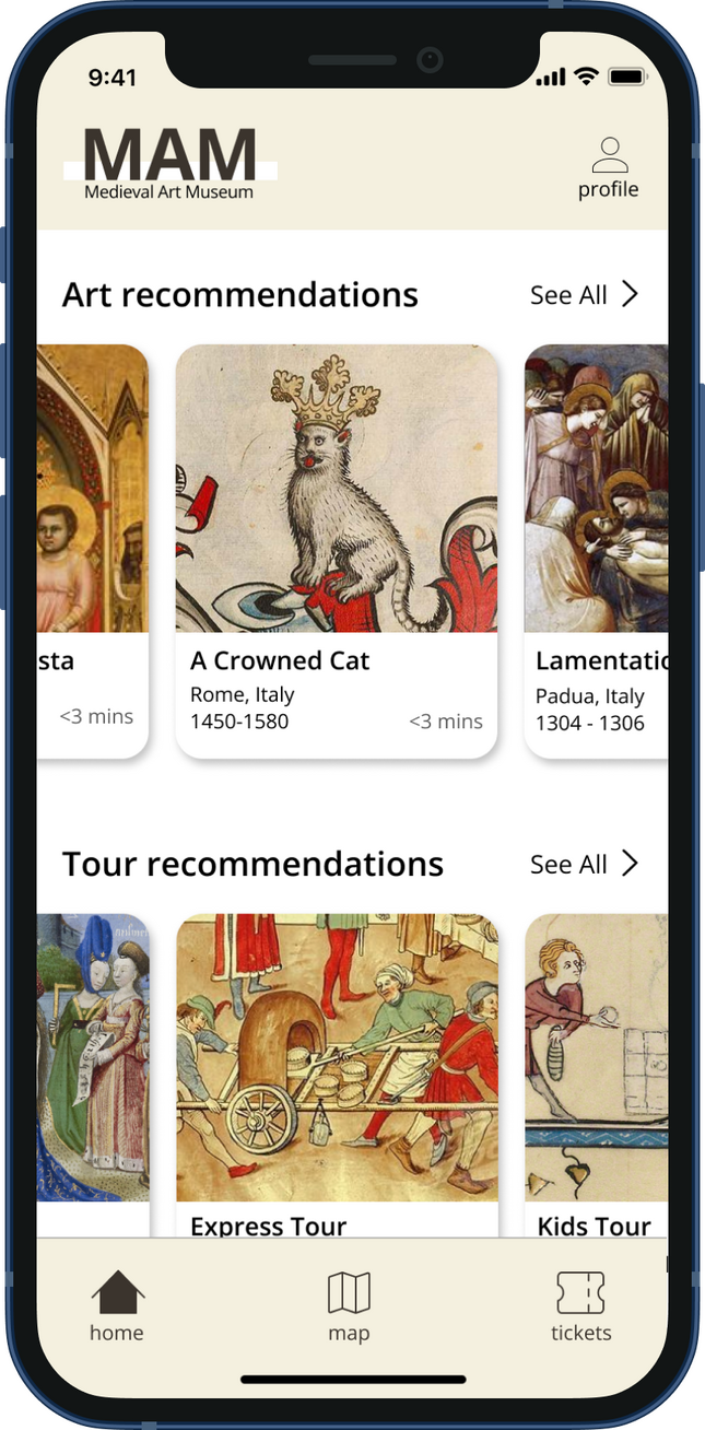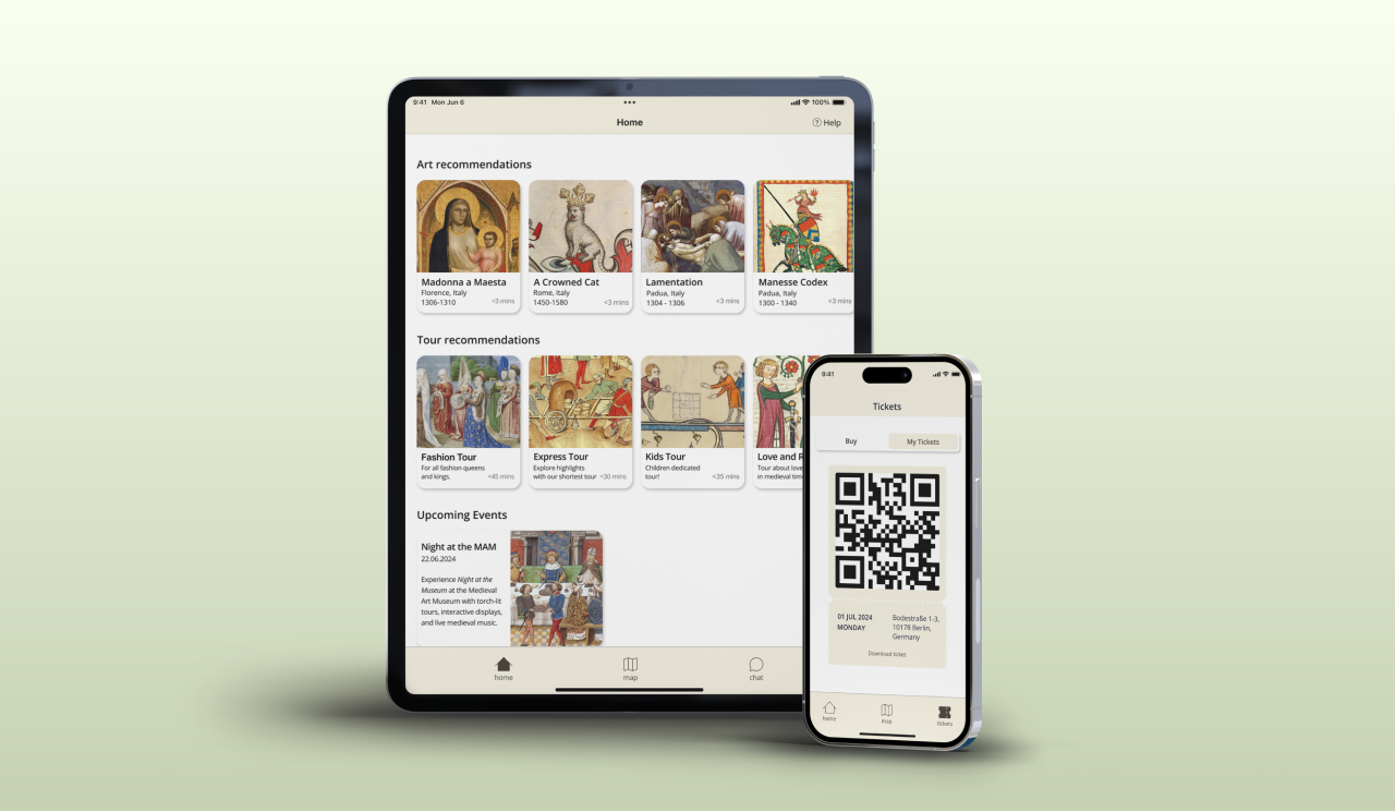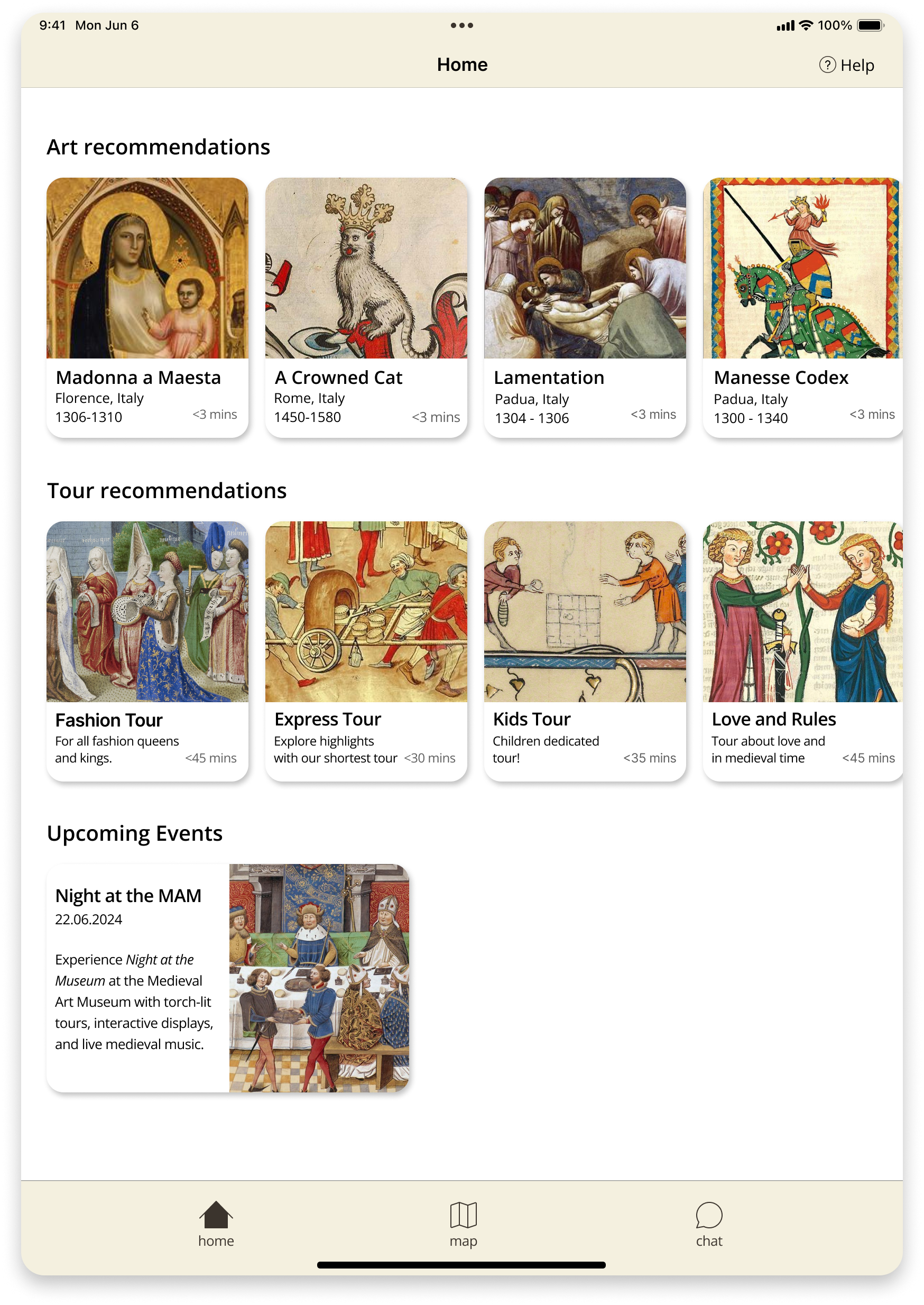 Users see recommendations for individual art pieces and suggested tours on the home screen. Museum visitors can also find out details about upcoming events in the museum.
