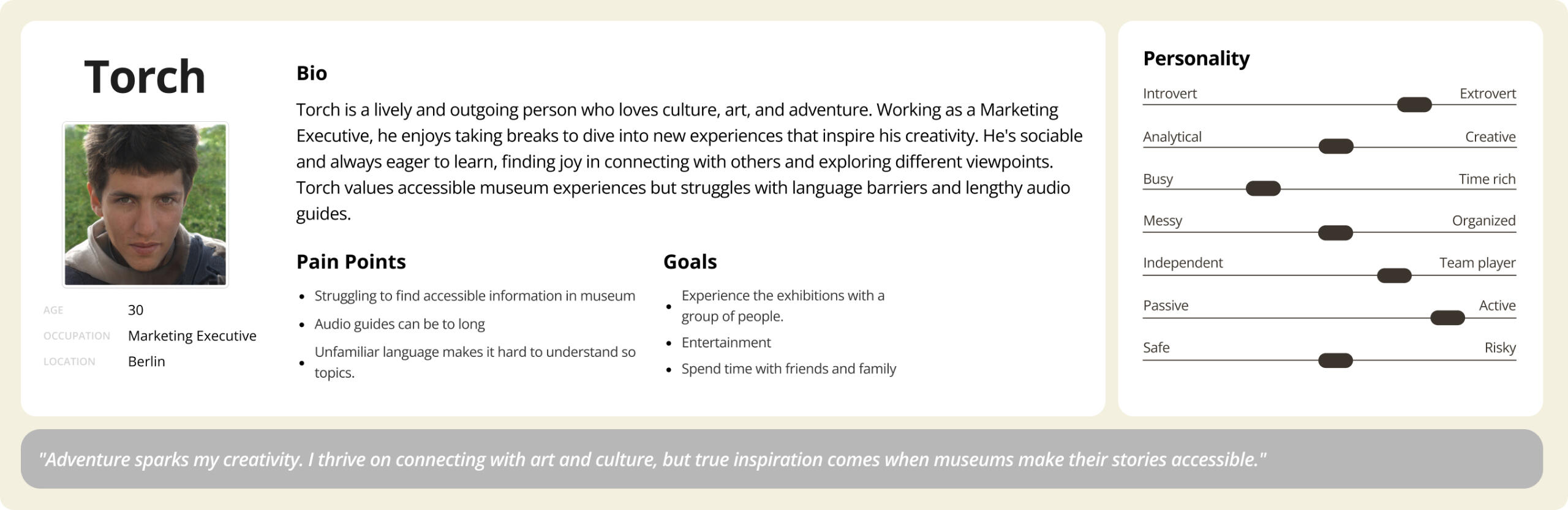 After collecting insights from our research, we crafted the persona of Torch, a dynamic individual whose story reflects the common experiences shared by many of our participants. Based on data gathered from interviews and surveys, Torch is a Marketing Executive who lives for culture, art, and adventure. His lively personality and love for creativity drive him to seek out new experiences, whether it's exploring a museum exhibition or sharing a new perspective with friends.However, despite his enthusiasm, Torch faces a few challenges when it comes to fully enjoying his cultural adventures. He often finds himself struggling with museum information that isn’t easily accessible. Lengthy audio guides and unfamiliar languages can turn what should be an inspiring experience into a frustrating one. Torch values the opportunity to engage deeply with the exhibits, but these barriers sometimes prevent him from fully understanding and enjoying the content.Torch’s goals are simple yet meaningful: he wants to experience exhibitions with a group of people, find entertainment, and spend quality time with his friends and family. For him, the ideal museum experience is one where he can easily access information, share moments of discovery with loved ones, and leave feeling inspired and connected. This persona helps us design solutions that make cultural experiences more inclusive and enjoyable for everyone like Torch.