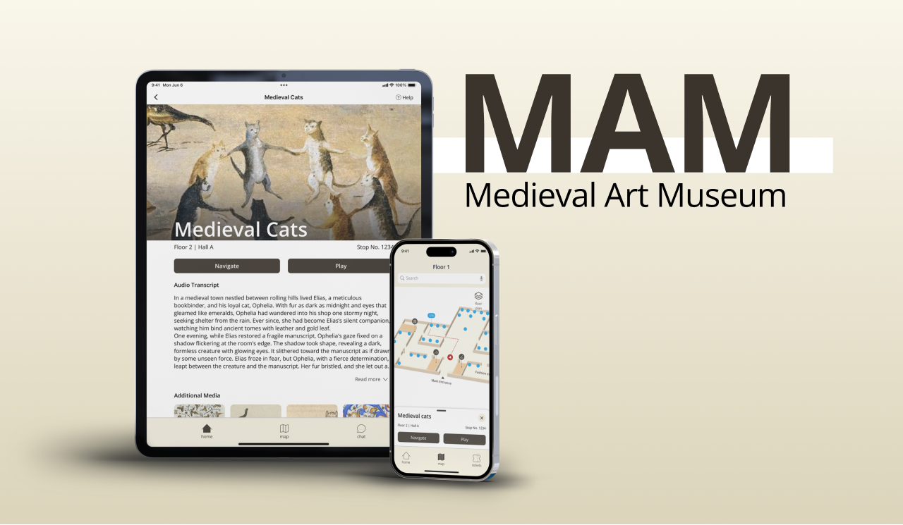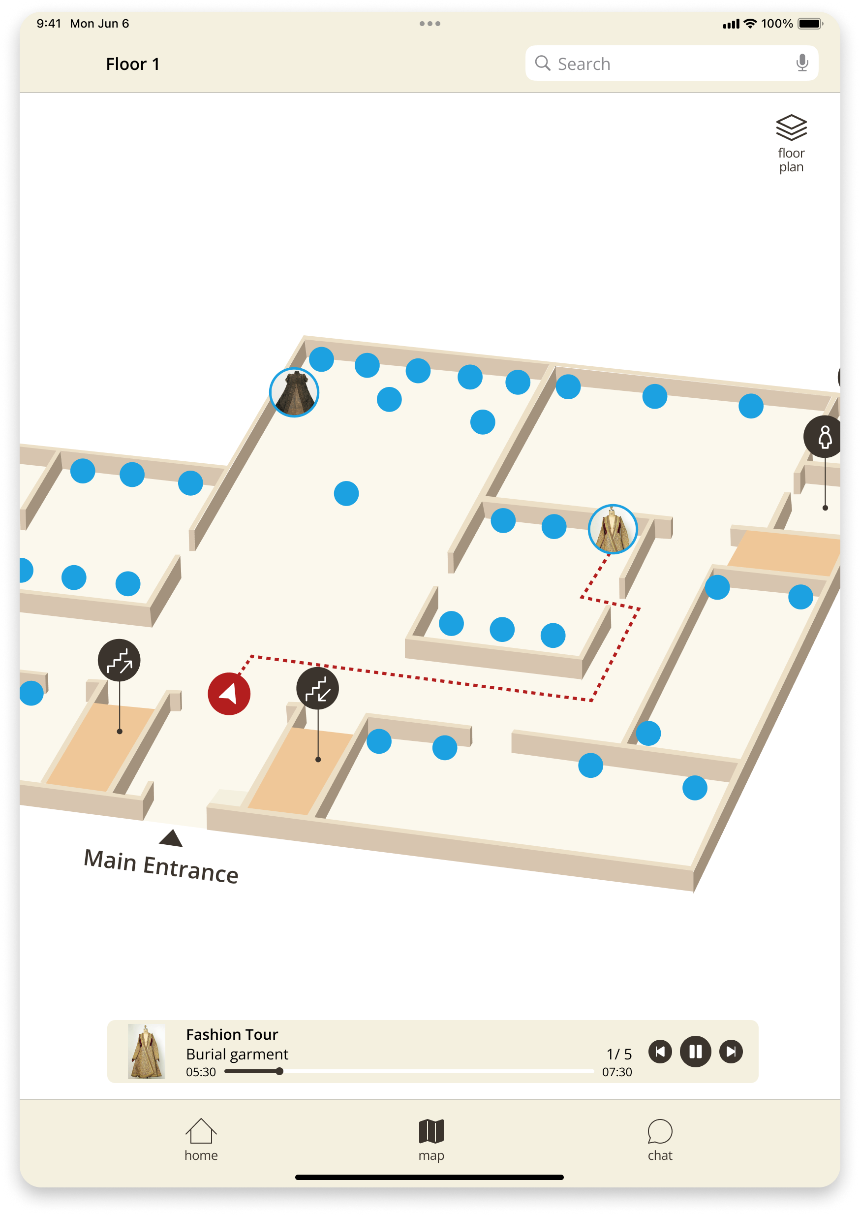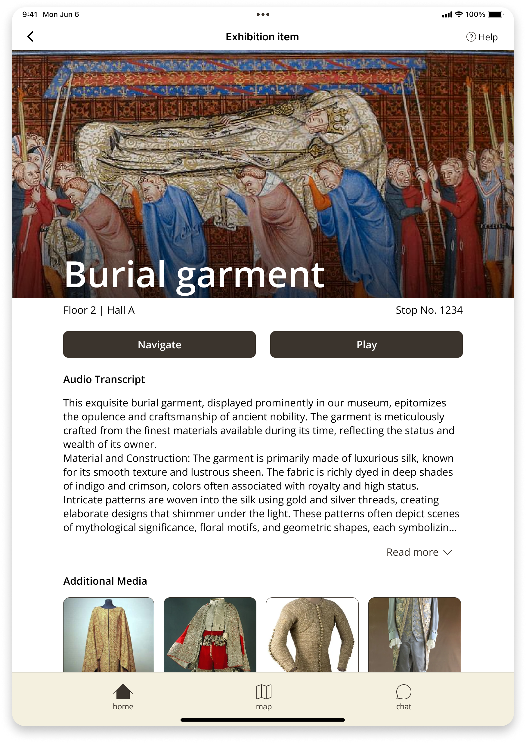 The first exhibit is a burial garment. Museum visitors can read information about it, as well as watch videos and additional images on this topic. Using the navigation, they know how to get there. On the audio guide, users can change the exposition and the navigation will lead them to another work of art.