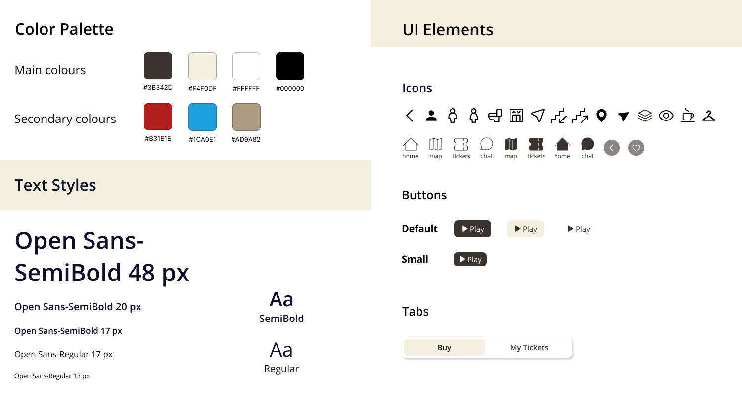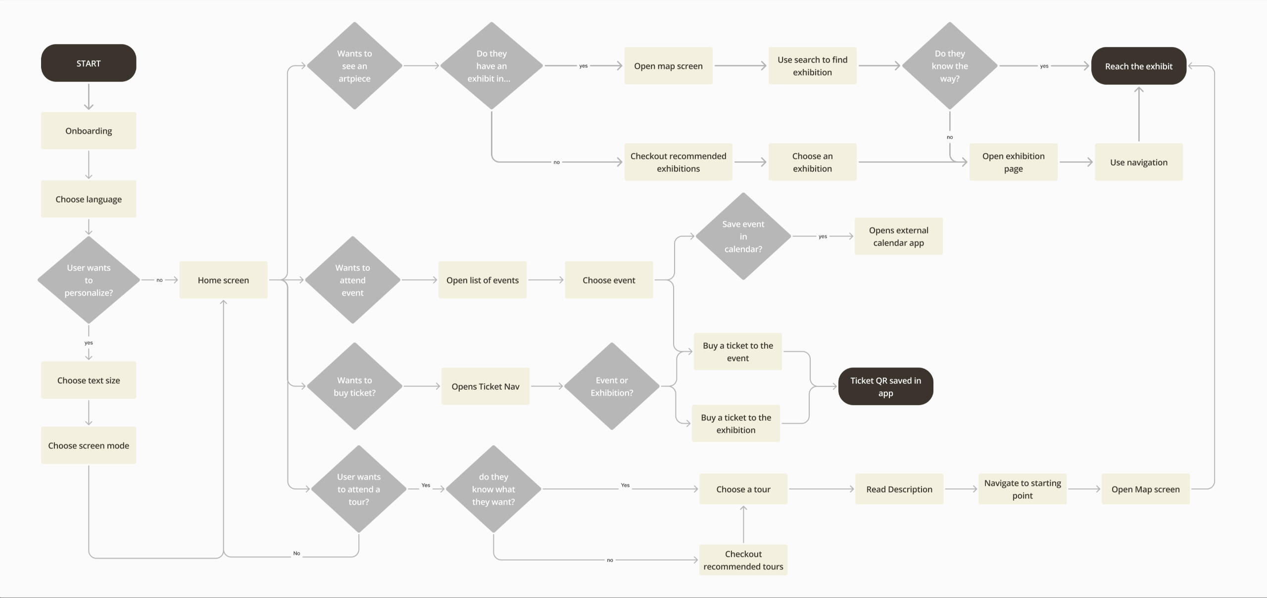 To visualize the mobile user journey, we created a user flow that outlines key interactions within the app — from browsing exhibitions to purchasing tickets and accessing guided tours. This helped us define a streamlined experience that supports intuitive navigation and meets the needs of visitors in various contexts.