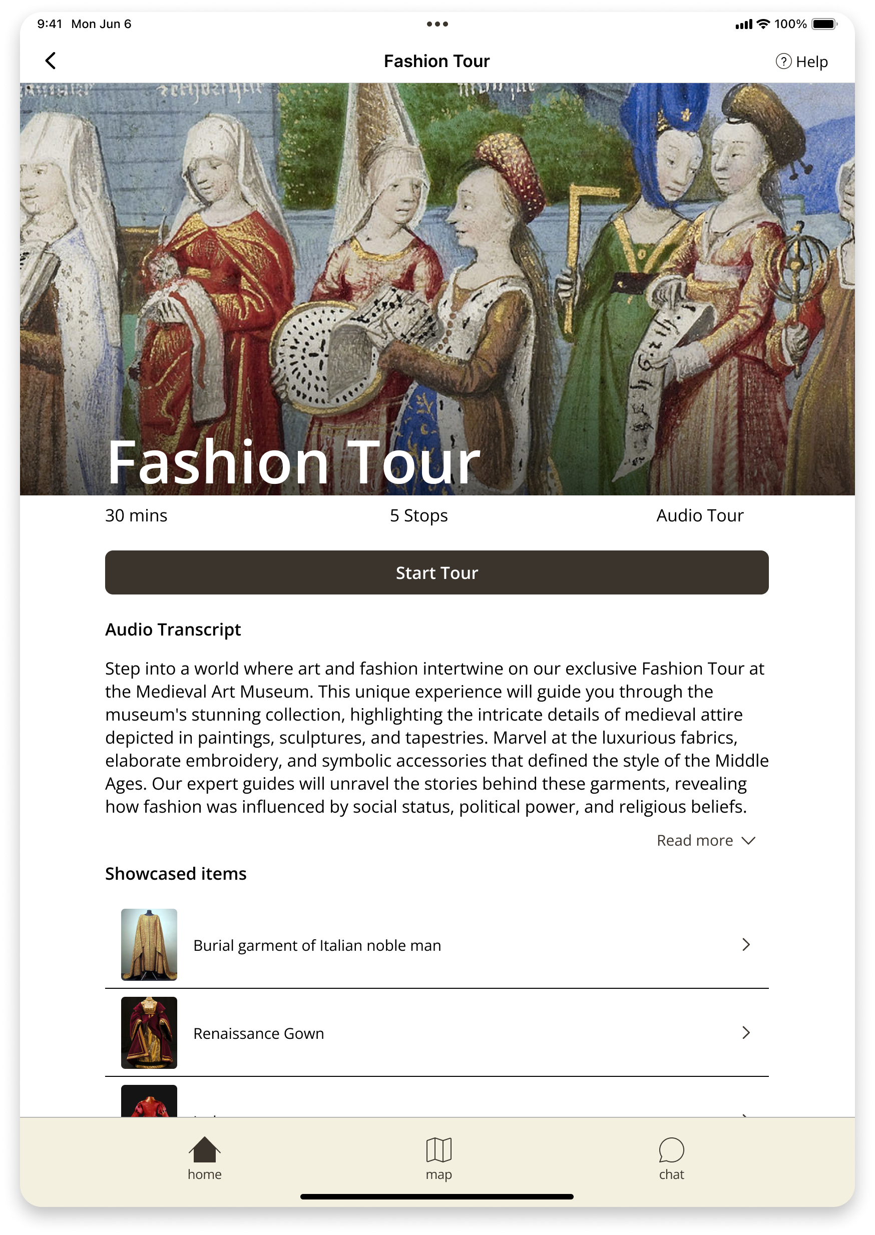 Let’s imagine, that users are going to take a fashion tour to find out what fashion was like in medieval times. On the map, they can see the works of art that have been selected specifically for this tour.