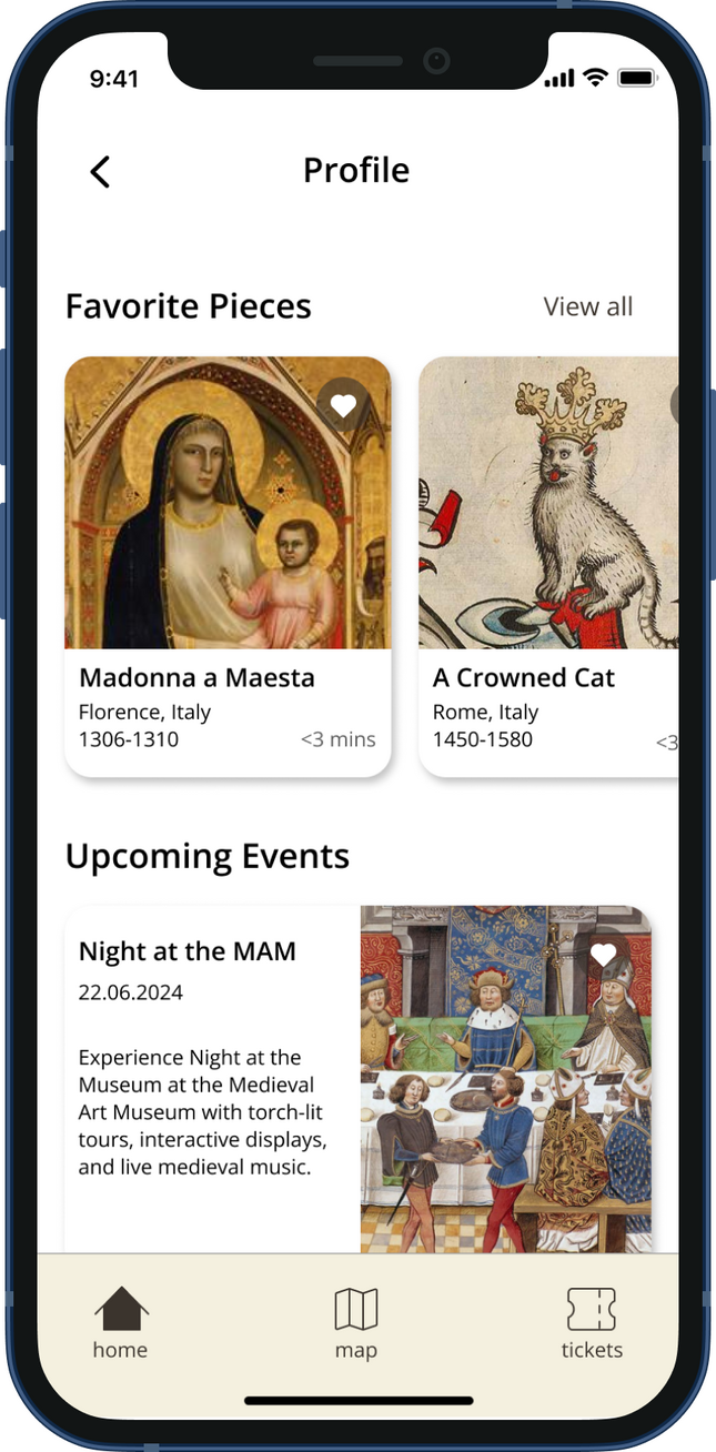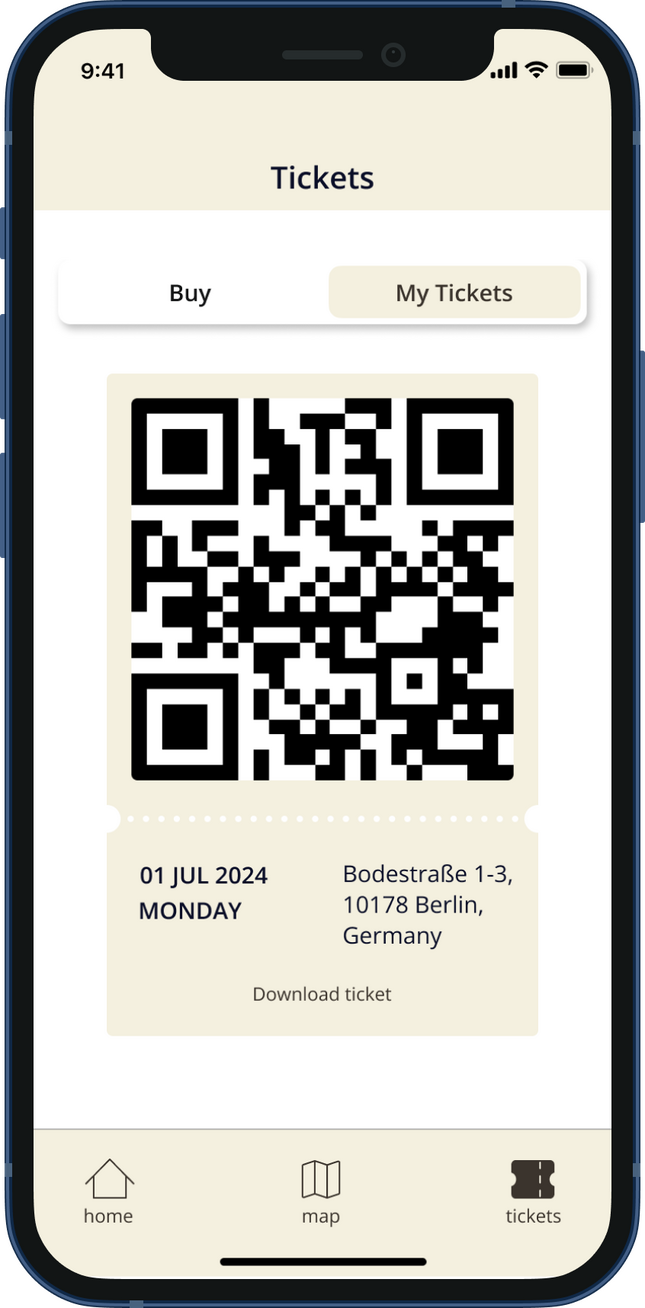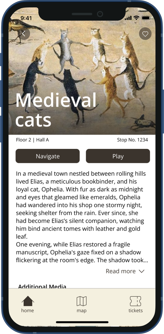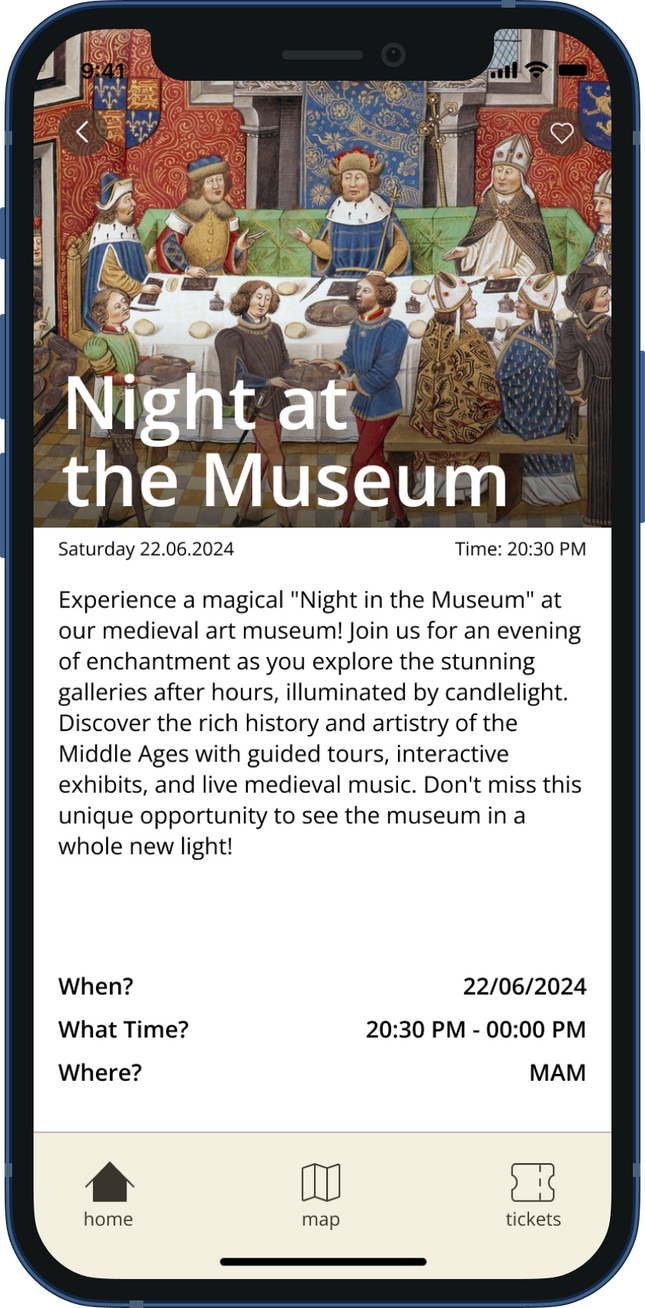 In addition to the tablet version, we explored how the museum experience could be translated into a mobile app. The mobile design focuses on quick access to essential features such as ticket booking, exhibition highlights, and audio guides — all optimized for use on the go. This version ensures that users can engage with the museum before, during, and after their visit, directly from their smartphones.