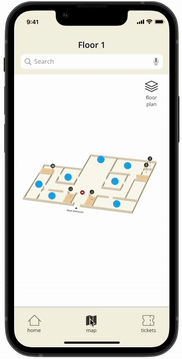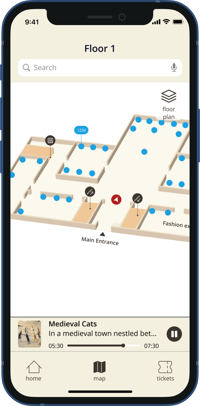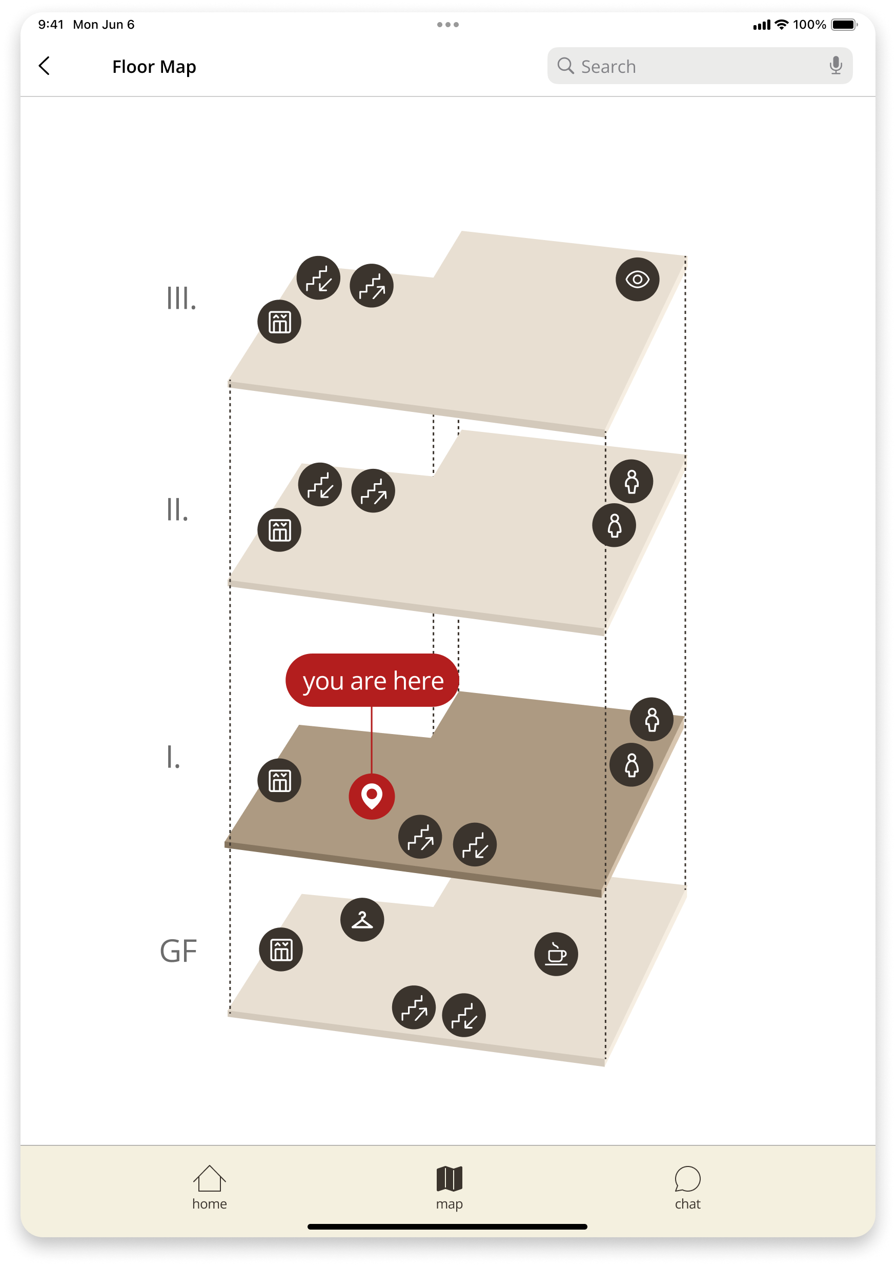 If users need to change the floor of the museum, they click on the floor map. There they can find toilets, changing rooms, a cafe, and an observation deck.
